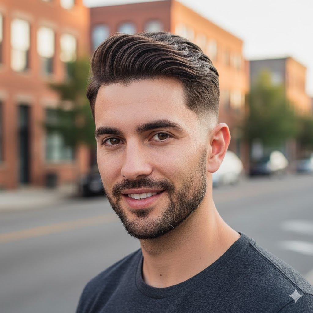 A long comb over with fade brings balance between volume and structure. The fade adds sharpness, while the length on top gives movement and freedom to style.