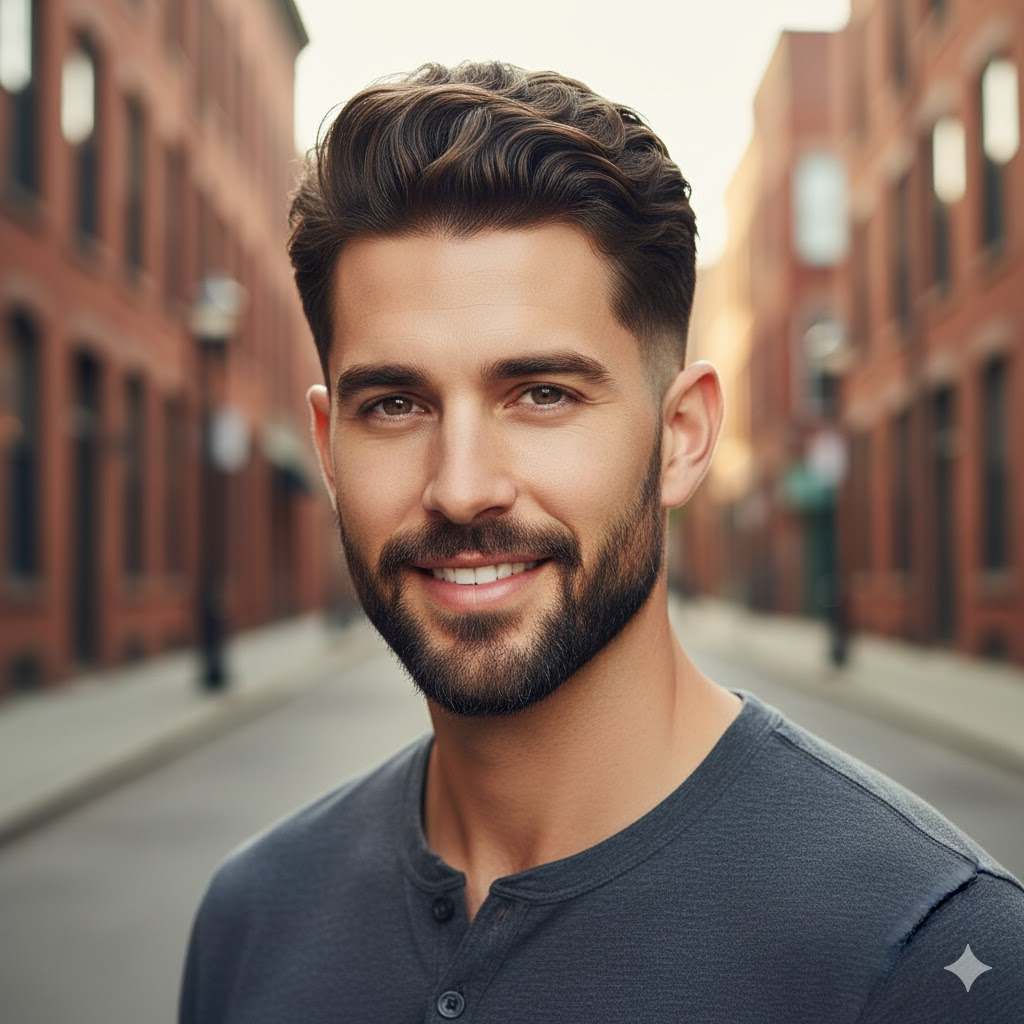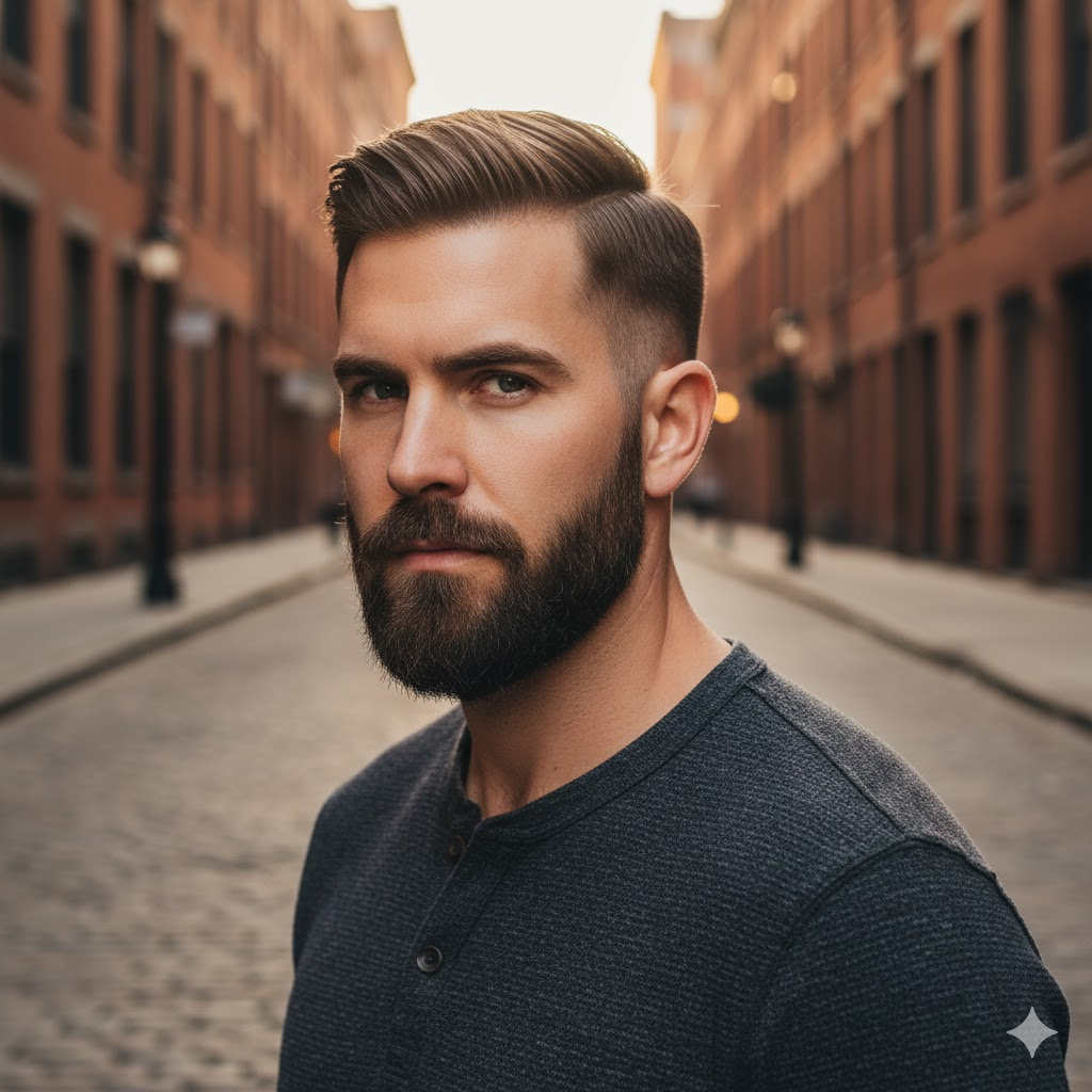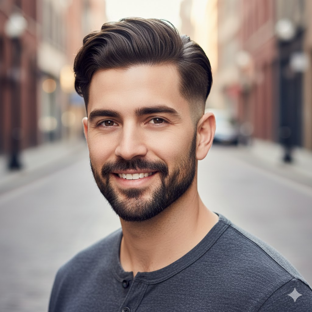 The textured comb over is a stylish choice for men who want something casual yet sharp. It combines soft texture with a structured side sweep for a relaxed, modern vibe. Pair it with a mid or low fade and use a matte product for volume and hold. A trimmed beard complements this style beautifully, giving it a bold, masculine finish.