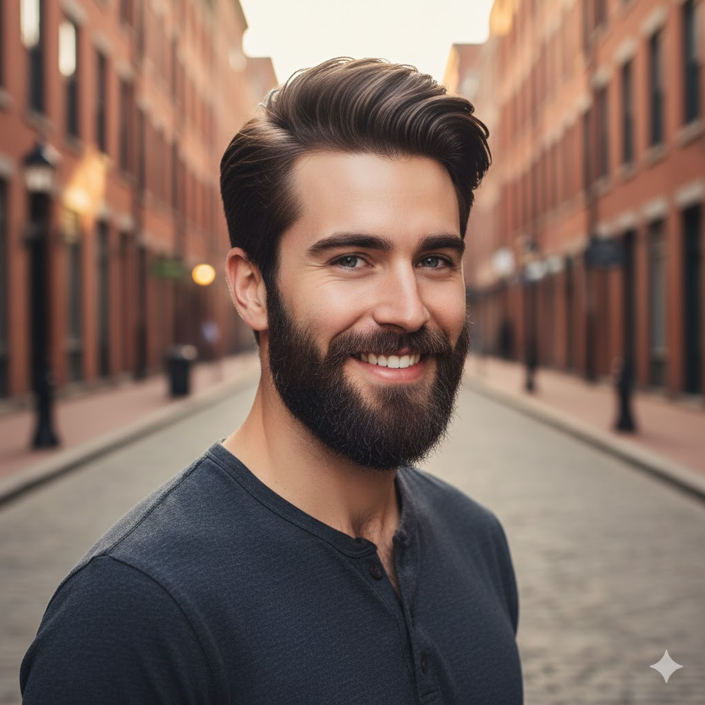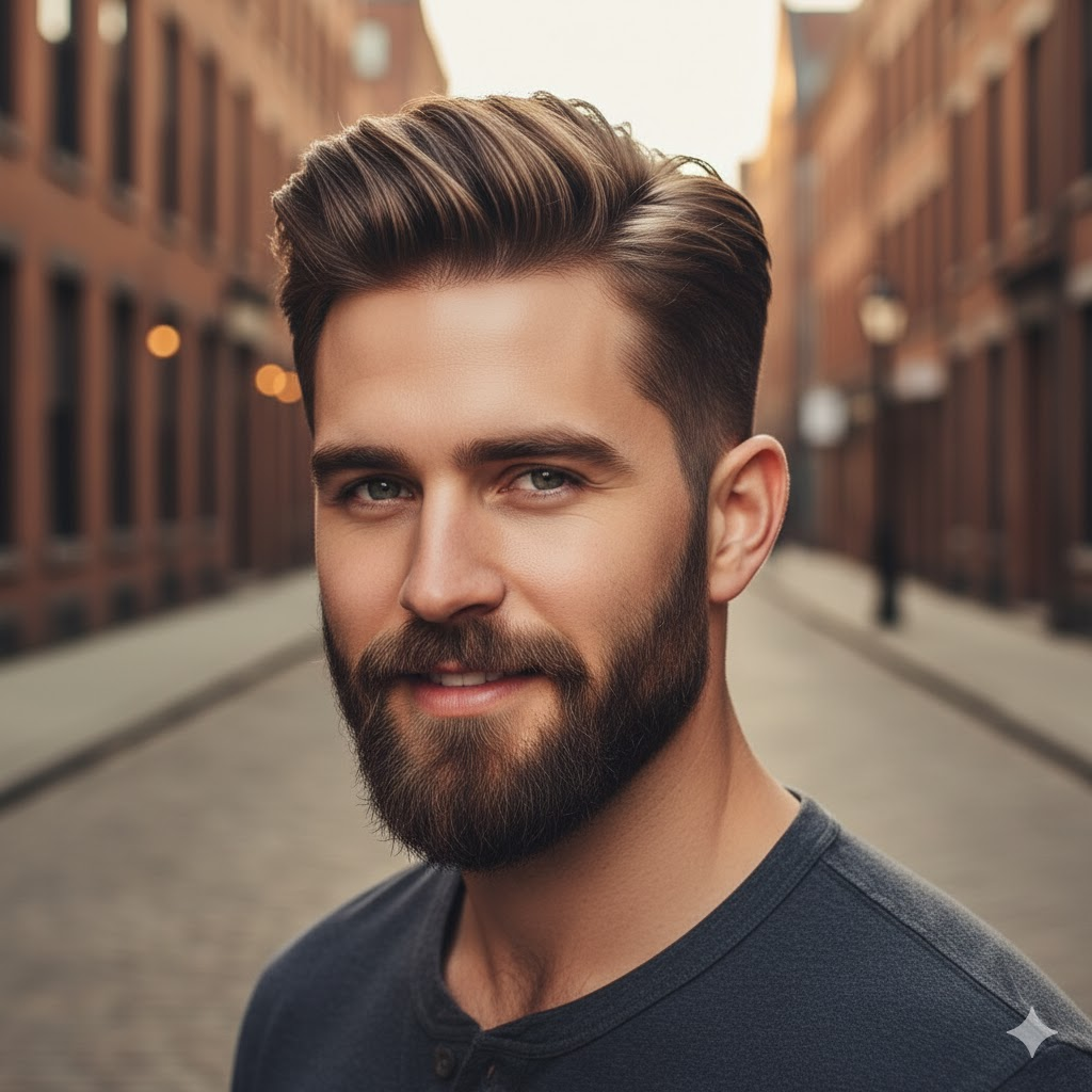 This version pairs perfectly groomed hair with a full beard, combining professionalism with bold masculinity. Keep the sides tapered and the beard trimmed for a clean, balanced appearance. Use a light cream for a smooth, natural finish.