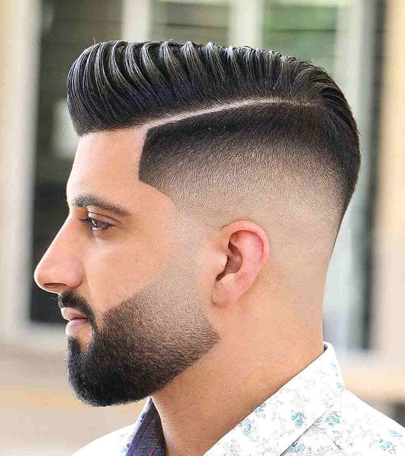The comb over fade is a trendy men’s haircut that highlights the contrast between short faded sides and longer top hair. The skin fade enhances the top’s volume and shape, while a razor part adds sharp definition. This look pairs well with both a clean shave and a beard. Use a small amount of clay and texturizing spray to control frizz and enhance texture.